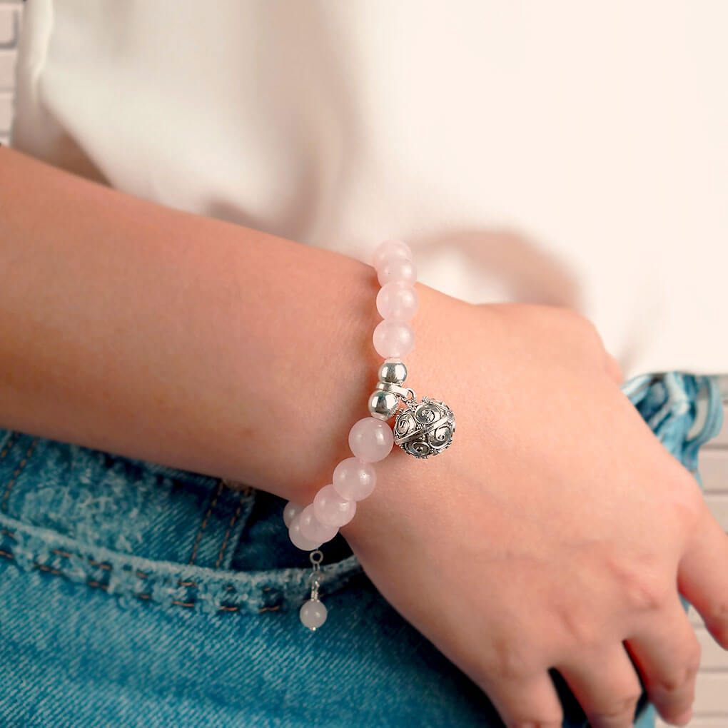 Esta encantadora pulsera combina la delicada belleza del cuarzo rosa, la “Piedra del Corazón”, con el sereno sonido de un llamador de ángeles. El cuarzo rosa irradia amor incondicional, fomentando la expresión de tus sentimientos, fortaleciendo el carácter y nutriendo la autoestima. Potencia el corazón, enciende la energía romántica e inspira compasión hacia ti mismo y hacia los demás. El llamador de ángeles, un amuleto sagrado que se cree conecta con la protección celestial, añade un toque espiritual, invitando paz y armonía a tu vida. Juntos crean una pieza atemporal que encarna amor, fortaleza y guía divina.