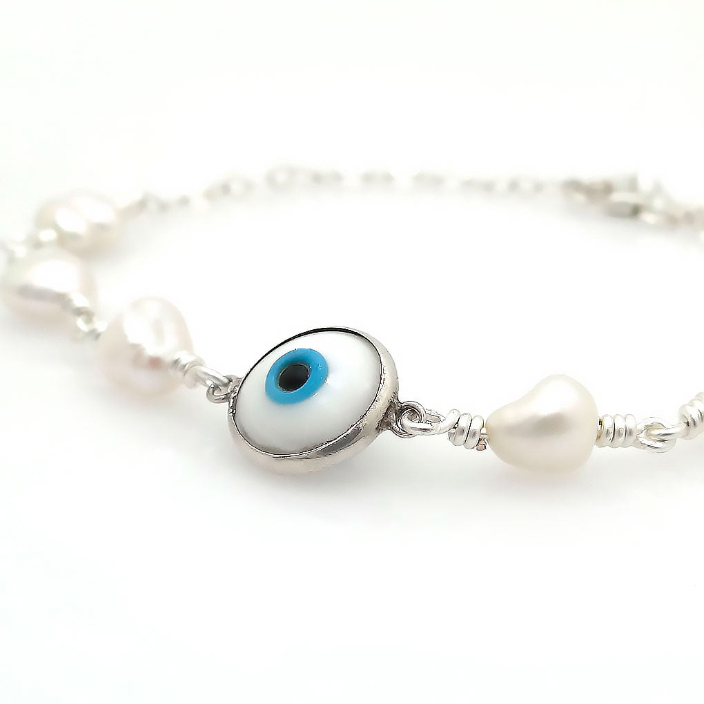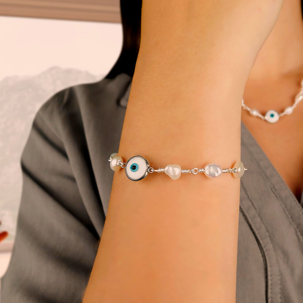 Protege tu energía con nuestra Pulsera de Protección con Ojo Turco y Perla Natural, un accesorio lleno de significado y elegancia. El ojo turco, o “nazar”, es un amuleto tradicional que protege contra las malas energías y la envidia, absorbiendo lo negativo y atrayendo buena fortuna. Combinado con perlas naturales, símbolo de pureza, inocencia y sabiduría, esta pulsera aporta calma emocional, armonía y conexión con la energía femenina y lunar. Perfecta para quienes buscan protección, elegancia y equilibrio en su día a día.