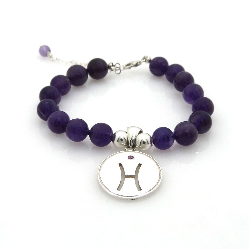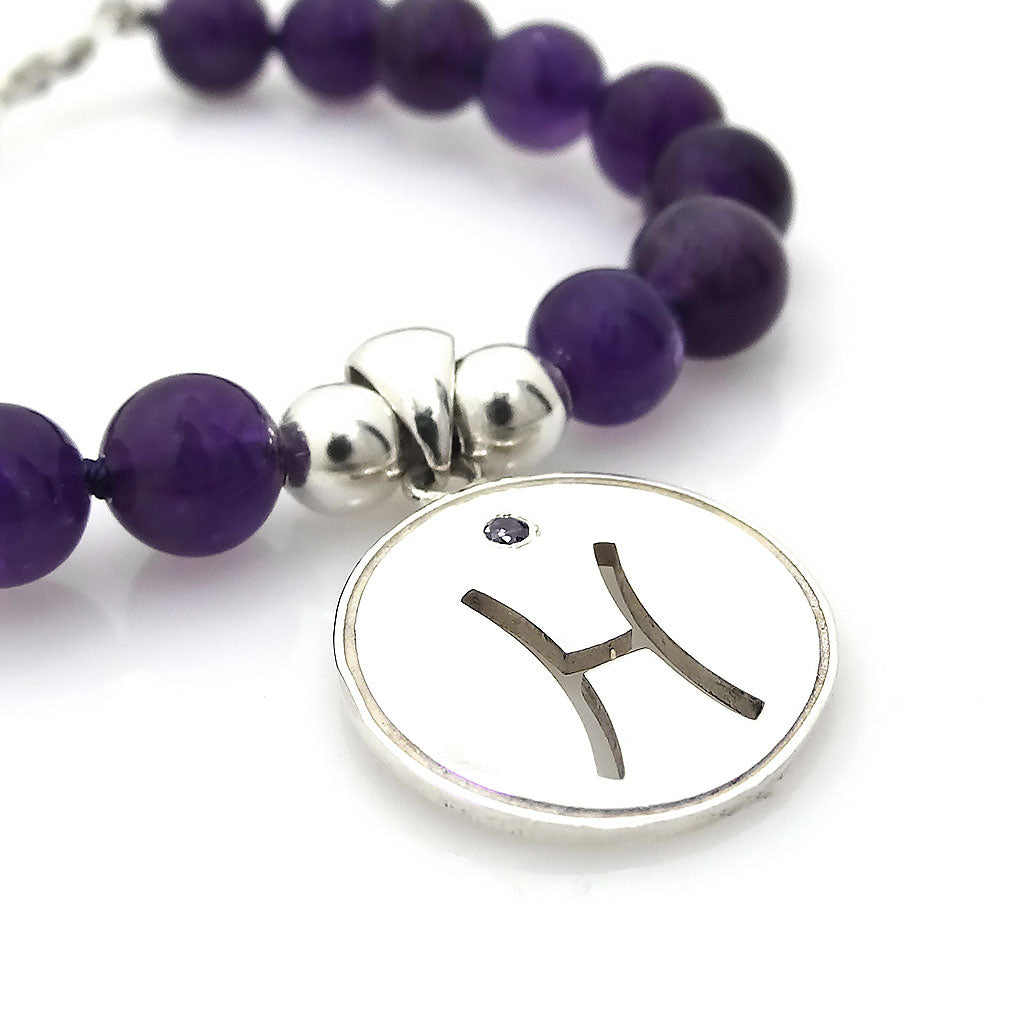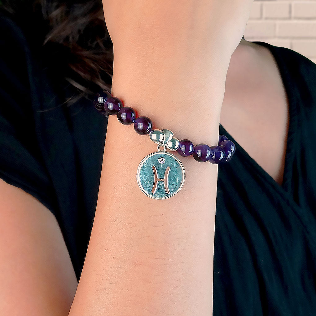Está especialmente diseñado para abrazar la naturaleza sensible y compasiva de Piscis. Al igual que los piscianos, la amatista, conocida como "La Piedra de la Tranquilidad", aporta relajación y equilibrio, alivia el estrés y promueve la claridad mental. Su capacidad para fomentar la intuición y la toma de decisiones acertadas refleja la profunda naturaleza de Piscis, que tiende a ser emocional y comprensiva. Como soñadores, los piscianos encontrarán en este brazalete una conexión con su rica vida interior. La amatista también los ayudará a enfrentar los desafíos de la indecisión, recordándoles la importancia de mantener la tranquilidad y el equilibrio emocional en todo momento.