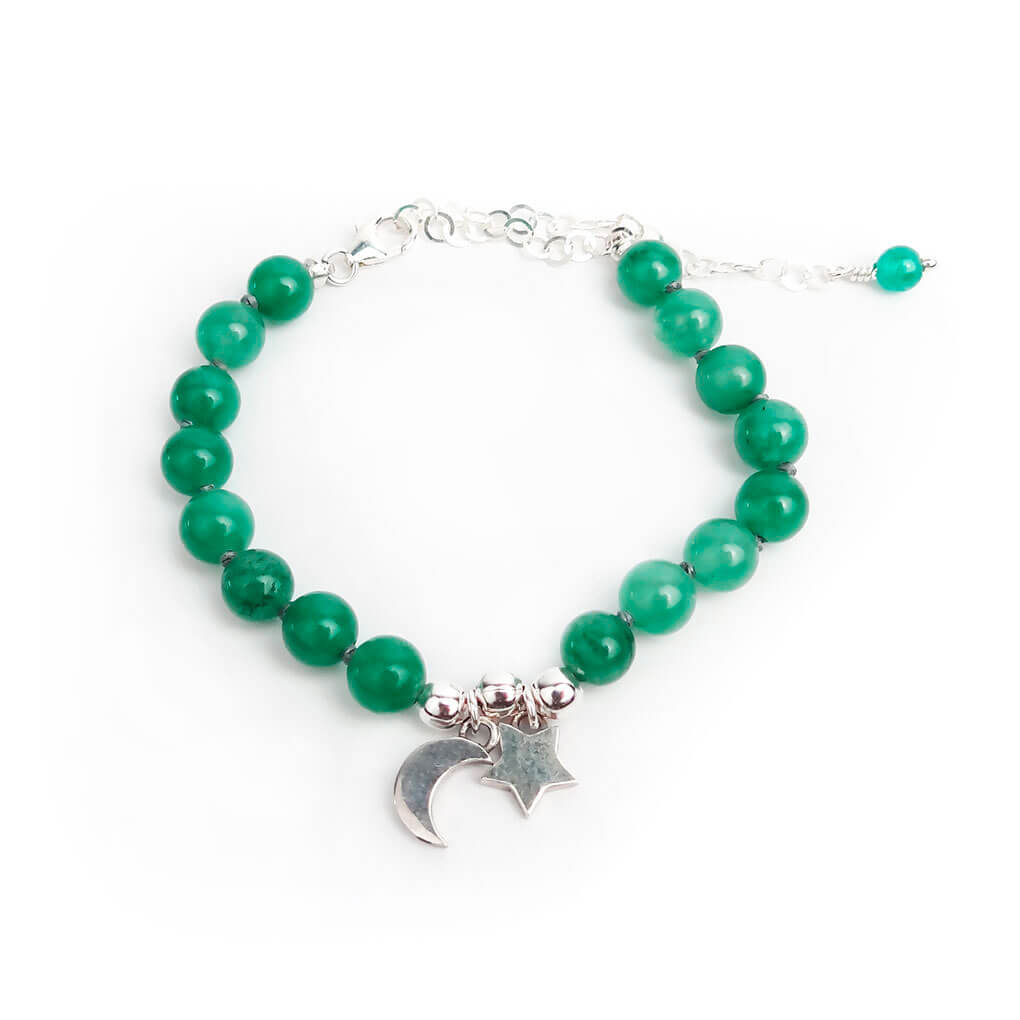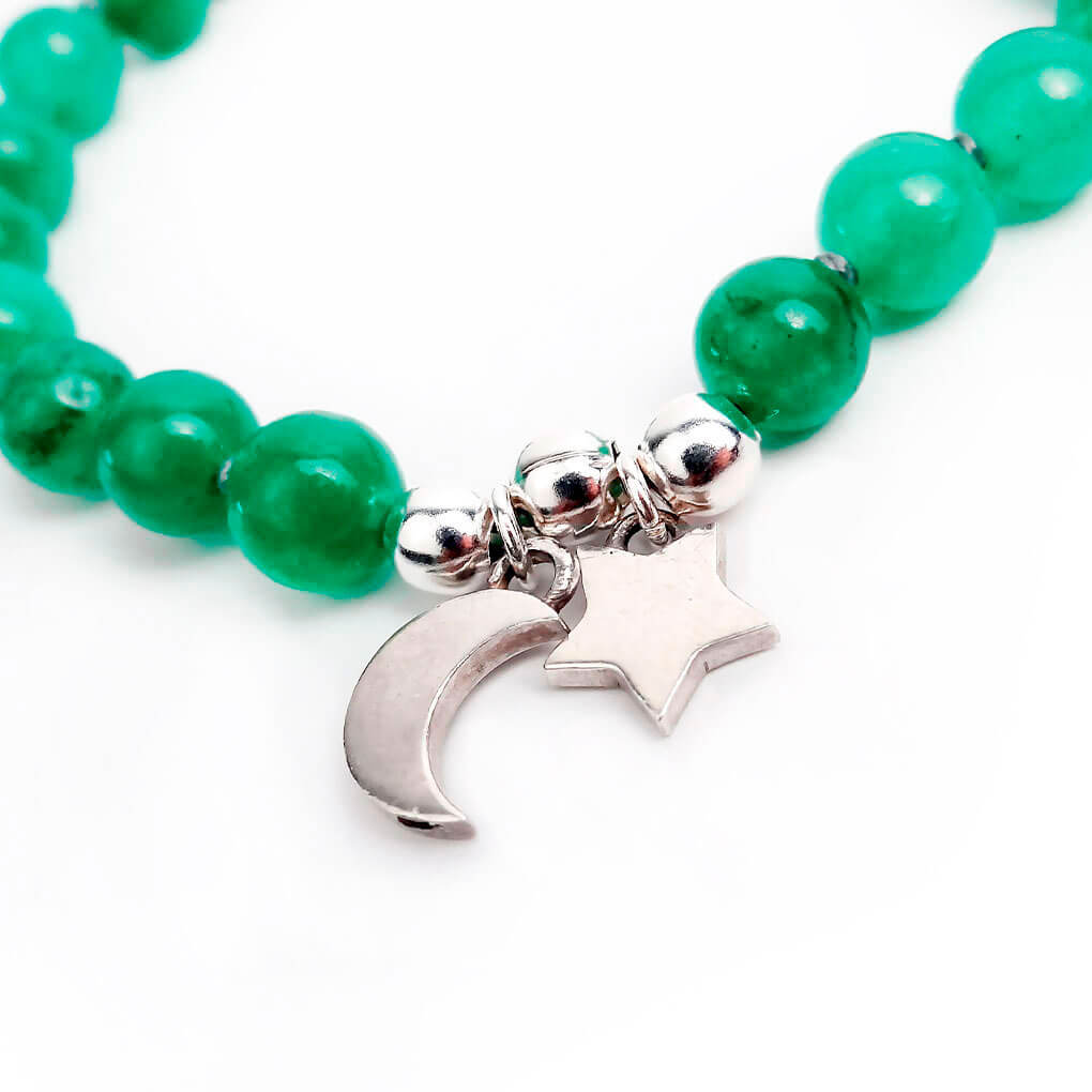 Esta pulsera de jade natural presenta dos delicados charms: una estrella y una luna, cada uno con un profundo significado. La estrella representa luz, guía e inspiración, recordándote seguir tus sueños y dejar brillar tu singular brillantez. La luna evoca misterio, intuición y transformación, guiándote a través de los ciclos de la vida con gracia y profundidad emocional. En su corazón, el jade, conocido como la “Piedra de la Abundancia”, ofrece protección, calma y equilibrio emocional, ayudándote a liberar la negatividad y reconocer los dones ilimitados del universo. Juntos, estos elementos crean una pieza atemporal que inspira esperanza, paz interior y una conexión más profunda con tu verdadero yo.